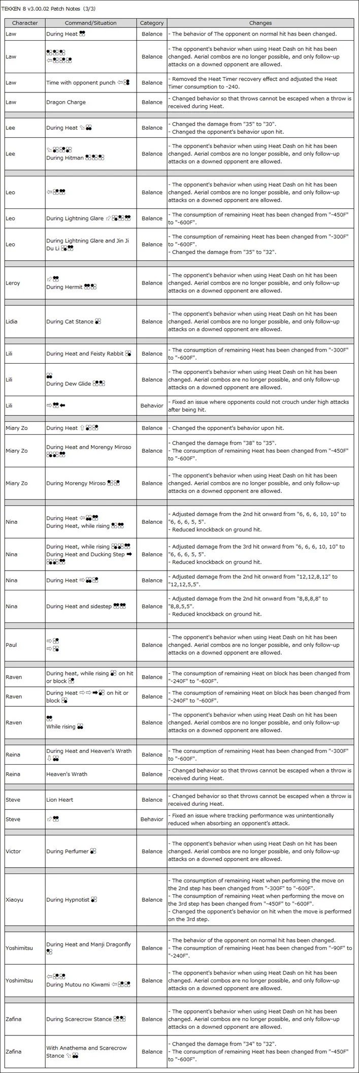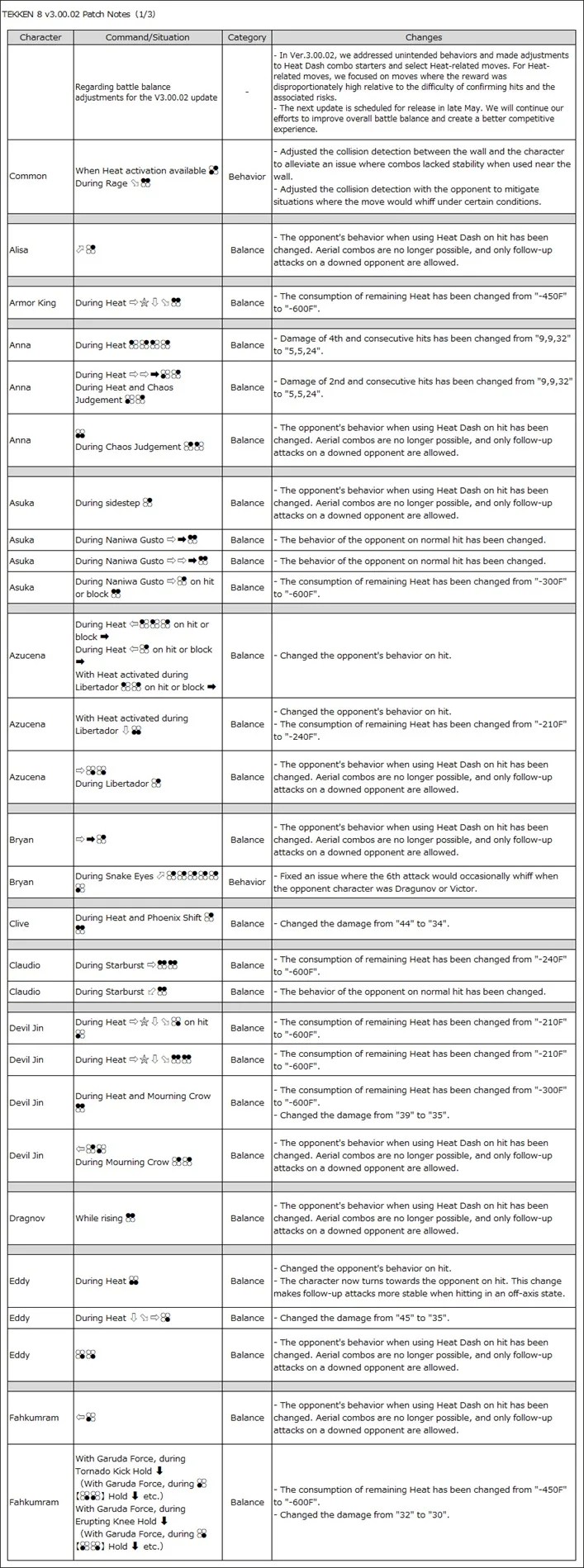 С версией 3.00.02 мы исправили некоторые неожиданные проблемы и улучшили начало комбо с помощью Heat Dash, а также определенные приемы, использующие Heat. В частности, мы рассмотрели приемы, в которых было слишком легко получить большую награду, учитывая, насколько сложно их было выполнить и какие риски были связаны.