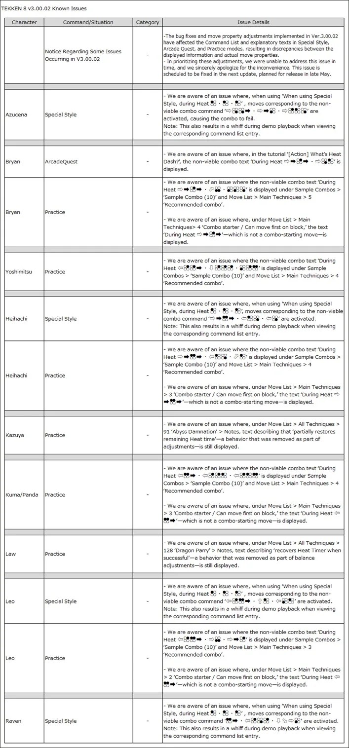 Обновление 3.00.02 включало исправления ошибок и изменения в работе приёмов. К сожалению, это привело к неточностям в списках команд и объяснениях в режимах Special Style, Arcade Quest и Practice. Отображаемая информация не всегда соответствует фактической работе приёмов.