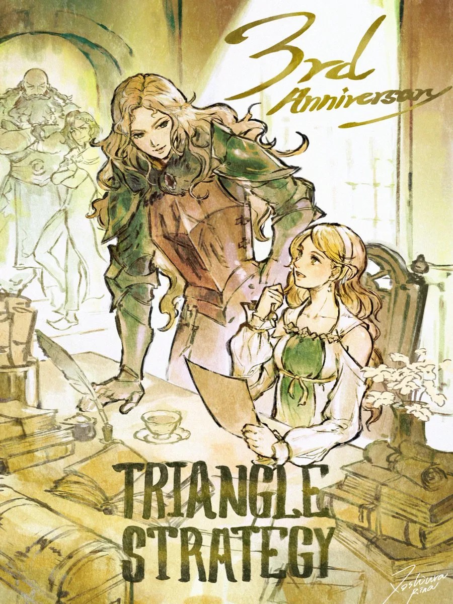 В праздновании третьего года после запуска игры Square Enix поделился свежими произведениями стратегии треугольника в Twitter/X, чтобы поклонники могли наслаждаться. Новое юбилейное искусство стратегии треугольника было прекрасно создано Риной Йошиурой, талантливой художницей из команды Асано.